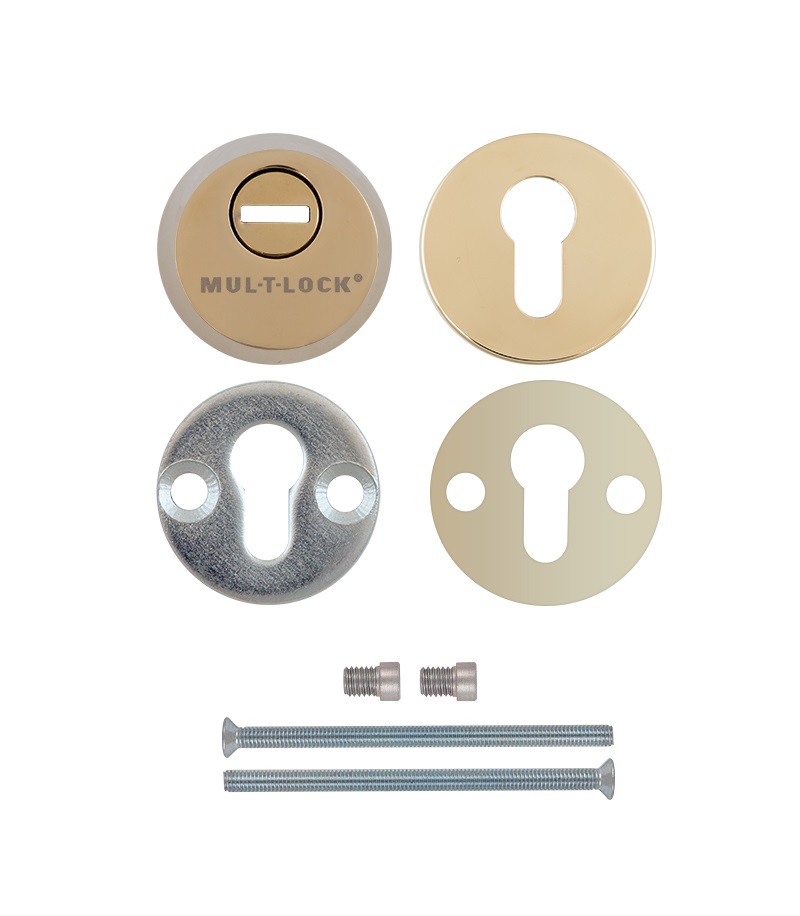 Протектор (або броненакладка) є обов'язковим аксесуаром вхідних дверей для захисту Вашої оселі. Оскільки їхньою найслабшою точкою є замок з серцевиною, то дуже часто злочинці намагаються потрапити всередину приміщення просто вириваючи їх. Для протидії такому методу взлому і потрібна броненакладка. Дана модель MUL-T-LOCK SL3 встановлюється на вхідні двері разом із замками і серцевинами стандарту EURO DIN. Це захисний протектор з 3-м класом зламостійкості. Виготовлений із гартованої сталі. Монтується накладним методом. Він простіший за врізний та не потребує висвердлювання отворів для посадки броненакладки. Проте в такому випадку вона не утворює із замком монолітну конструкцію, через що легше дістатись до стяжних гвинтів і зрізати їх. Чашка дозволяє трохи втопити протектор, але всерівно простір між ним і серцевиною залишається. Саме кріплення здійснюється стяжними гвинтами М8х75. Довжина гвинтів дозволяє ставити броненакладку на дверні полотна товщиною від 58 до 63 мм. Ці цифри вказані з урахуванням того, що гвинти закручені на всю довжину кріпильного отвору. Таким чином, протектор захищає серцевину від фізичних та силових методів злому — свердління та вибивання. Висота (або товщина) протектора складає 14,5 мм, діаметр - 55 мм. В кольорі “латунь полірована” найкраще буде доповнювати двері світлих відтінків з бархатистим і соковитим покриттям - тим же шпоном вишні або груші.