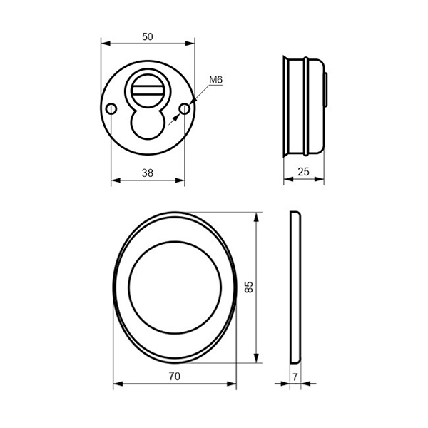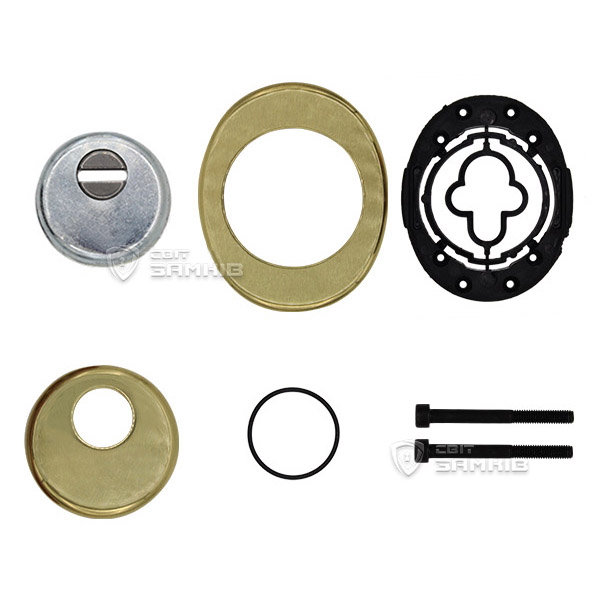 Для монтажу по діаметру протектора робиться отвір в дверному полотні. Кріпиться довкола серцевини стяжними гвинтами, створюючи монолітну конструкцію aз нею. Таким чином, протектор захищає її разом із точкою кріплення в дверях від фізичних та силових методів злому — свердління, виламування та вибивання. Доступу до гвинтів кріплення немає і зірвати саму броненакладку надзвичайно складно. Висота (або товщина) її складає 25/33 мм, діаметр - 50 мм. Комплектується декоративною накладкою розміром 85х70 мм для надання дверному полотну більш охайного вигляду. В кольорі “полірована латунь” найкраще буде доповнювати двері світлих відтінків.