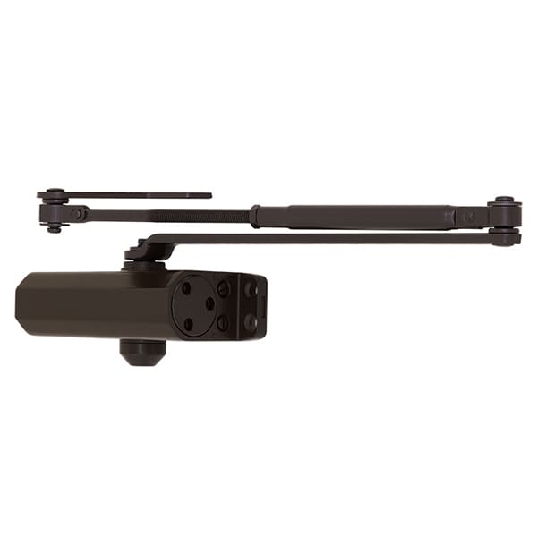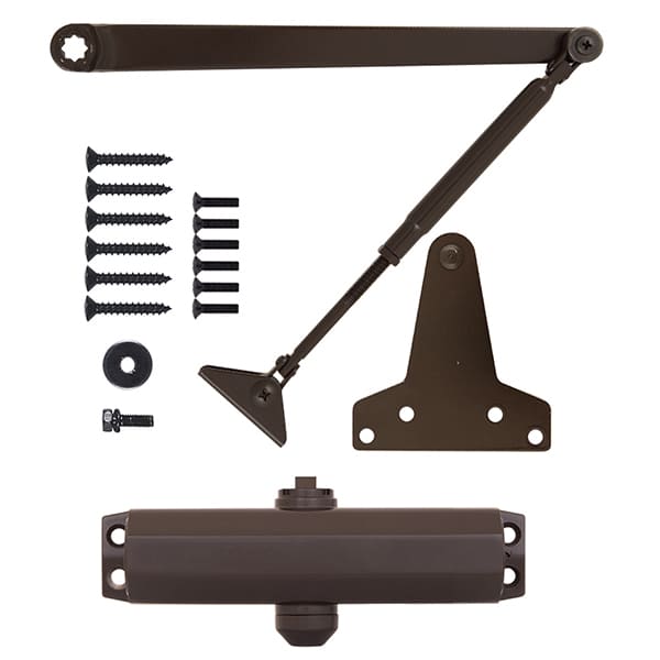 Продукція японського виробника RYOBI по праву визнана в усьому світі завдяки своїй відмінній якості. Дана модель RYOBI 8803 UNIV встановлюється накладним монтажем на легкі дверні полотна масою до 65 кг та шириною до 965 мм. Є можливість встановлення за допомогою кронштейна паралельного положення тяги відносно дверей задля збереження дизайну приміщення чи використання дотягувача в умовах обмеженого простору. Тоді максимальна вага і ширина полотна повинні бути меншими. Гідравлічний привід забезпечує чітку роботу дотягувача з кутом відкривання до 180°. Безпосередньо на корпусі є можливість регулювати основну швидкість в межах 180°-10° та швидкість захлопування - 10°-0°. Завдяки цьому можна досягнути індивідуального налаштування зачинення дверей так як Вам потрібно. Особливістю дотягувачів RYOBI є спеціальне термоконстантне масло. Воно забезпечує стабільну роботу навіть при великому перепаді температур. Взагалі робоча температура варіюється в діапазоні від -20 до +45°С. RYOBI 8803 UNIV може бути встановлений на ліво і правосторонні двері з можливістю відкривання як всередину так і назовні. В даній комплектації присутня стандартна тяга без фіксації дверного полотна у відкритому положенні. Проте даний дотягувач сертифікований для використання з протипожежними дверима. В коричневому кольорі найкраще буде доповнювати двері подібних темних відтінків для того, щоб максимально уникнути контрастів та не привертати зайвої уваги.