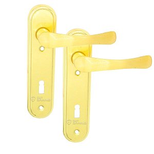 Польські ручки на планці – представляють собою практичну та надійну дверну фурнітуру за прийнятну ціну. Виготовляються із латуні, це міцний та приємний на дотик матеріал. Ручки з такого матеріалу стійкі до корозії та мають тривалий термін користування. Призначені для використання на вхідних або міжкімнатних дерев’яних та металевих дверях. Яскравий колір – золото – добре підійде для будинку чи квартири в світло-золотих тонах. Покриття методом гальваніки забезпечить надійних захист кольорового відтінку від подряпин та стирання. Під час вибору варто врахувати такий критерій як міжосьова відстань, вона може бути різною і залежить від механізму замка. Такі ручки мають тип планки під сувальдний ключ і підходять лише для сувальдних механізмів замка з типом ключа “буратіно” міжосьовою відстанню 72 мм. Процес кріплення планки до дверного полотна здійснюється за рахунок шурупів. Під час цього процесу важливо міцно зафіксувати ручки спеціальним гвинтом - гужоном, це збільшить термін експлуатації та дозволить уникнути проблем з провисанням ручок.