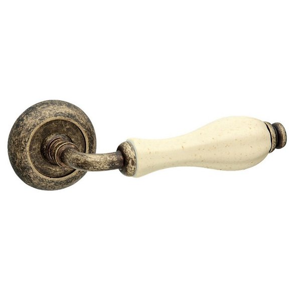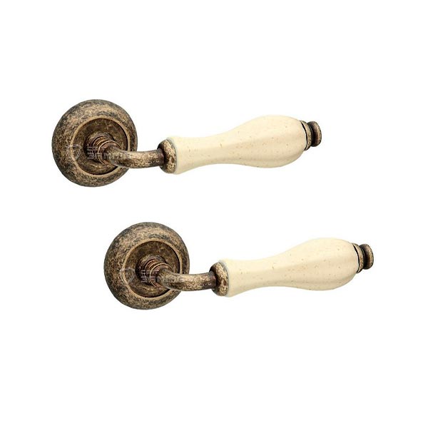 Італійські ручки на розеті популярної торгової марки FIMET. Найкращий вибір для міжкімнатних дверей. Виготовленні з високоякісного латунного сплаву за традиційними італійськими технологіями виробництва. Нажимна частина ручки приємно лягає в руку та зручна у використанні. Завдяки спеціальній двозавитковій пружині ручка не буде провисати. Багатошарове гальванічне покриття забезпечить стійкість кольорового відтінку до стирання та подряпин. Вдале поєднання кольорів – антична бронза/бежевий фарфор – буде гарно виглядати на білих або сірих дверних полотнах. Ця модель ручок підійде до дверей в класичному стилі і довершить загальну картину інтер'єру.