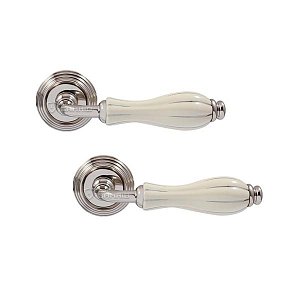 Італійські ручки на розеті популярної торгової марки FIMET. Найкращий вибір для міжкімнатних дверей. Виготовленні з високоякісного латунного сплаву за традиційними італійськими технологіями виробництва. Нажимна частина ручки приємно лягає в руку та зручна у використанні. Завдяки спеціальній двозавитковій пружині ручка не буде провисати. Багатошарове гальванічне покриття забезпечить стійкість кольорового відтінку до стирання та подряпин. Приємна нікелева основа та вставки з слонової кістки прикрашені срібними смужками – зроблять акцент на світлих дверних полотнах. Ця модель ручок підійде до дверей в класичному стилі і довершить загальну картину інтер'єру.