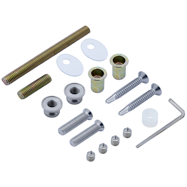 Половинка ручки-скоби фіксується за допомогою комплектних саморізів із нержавіючої сталі. На них вставляються спеціальні втулки та безпосередньо вкручуються в полотно. Далі насаджується ручка-скоба та фіксується гужоном. Якщо товщина профілю складає менше 3 мм, то в комплекті також є різьбові заклепки і гвинти з нержавіючої сталі для надійнішого монтажу.