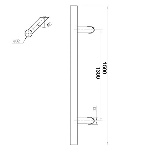 Довжина ручки становить 1500 мм, відстань між кріпленнями – 1300 мм. Профіль труби – круглий. Має діаметр 32 мм, що дуже зручно в повсякденному користуванні. Ручка кріпиться відносно площини дверей під кутом 45°. Це основні технічні критерії при виборі.