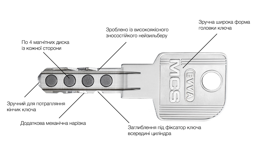 Магнітні елементи циліндра MCS відокремлені від каналу ключа і тому не можуть бути скановані або змінені.