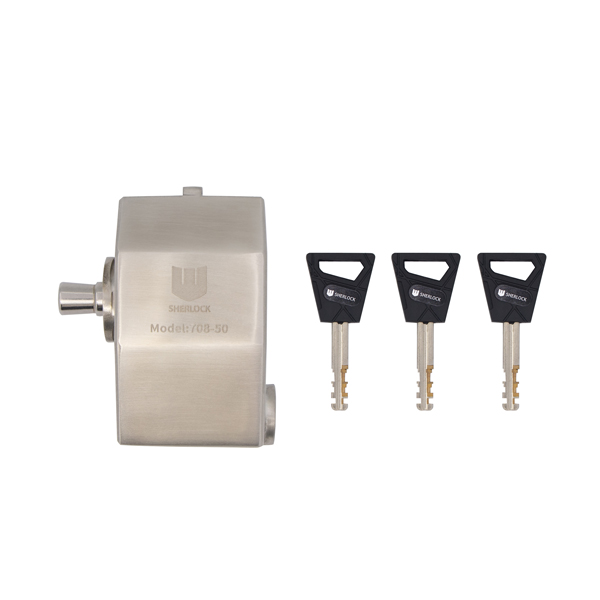 SHERLOCK 708-50 — навісний замок покращеного рівня безпеки крабоподібного типу. Завдяки особливій формі корпусу його неможливо спилити або збити. Чудовий варіант для складів, гаражів або інших промислових об’єктів.