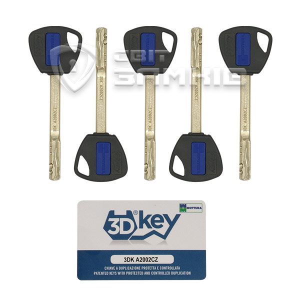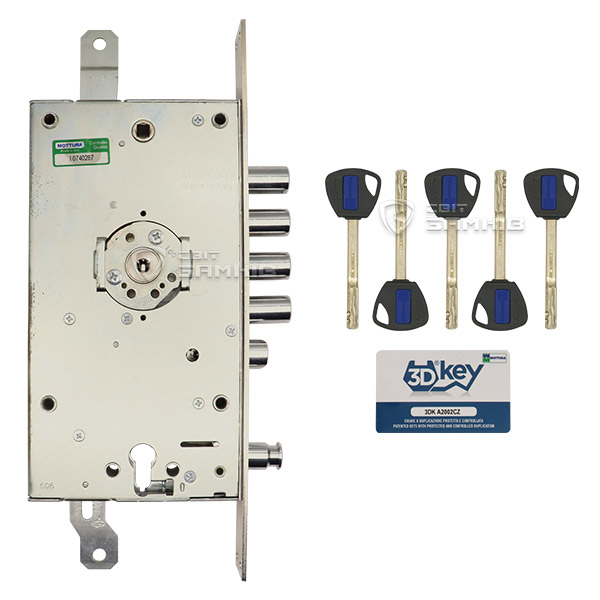 MOTTURA 3D KEY 3D.788 - двосистемний багатофункціональний замок з можливістю установки циліндрового механізму. 3DKey - замок найвищої захищеності для сталевих дверей, спроектований і вироблений виключно на фабриці MOTTURA. Має шестеренчастий привід. Особливістю є наявність унікального елементу - запатентованого нуклео. Воно забезпечує м'яке безшумне обертання ключа, в разі втрати якого нуклео легко замінити. Самі ж ключі мають шестикутний переріз з 3-ма кодованими поверхнями і 2-мя доріжками. Дублікати виготовляються тільки на заводі MOTTURA в Італії. Технологія 3DKey забезпечує 10 мільярдів можливих кодових комбінацій - найбільша секретність всіх замків даної ТМ. Перевершує за рівнем захищеності як замки з циліндровим механізмом, так і сувальдні. Замок встановлюється в якості основного замка на металеві двері. Також особливістю є товщина 25 мм, що дає можливість більш широкого використання, а також додаткового посилення замка за допомогою марганцевих пластин.