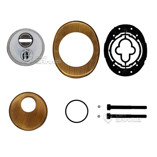 Для монтажу по діаметру протектора робиться отвір в дверному полотні. Кріпиться довкола серцевини стяжними гвинтами, створюючи монолітну конструкцію з нею. Таким чином, протектор захищає її разом із точкою кріплення в дверях від фізичних та силових методів злому — свердління, виламування та вибивання. Доступу до гвинтів кріплення немає і зірвати саму броненакладку надзвичайно складно. Висота (або товщина) її складає 25 мм, діаметр - 50 мм. Комплектується декоративною накладкою розміром 85х70 мм для надання дверному полотну більш охайного вигляду. В бронзовому кольорі найкраще буде доповнювати двері з пильно-землистої палітри.