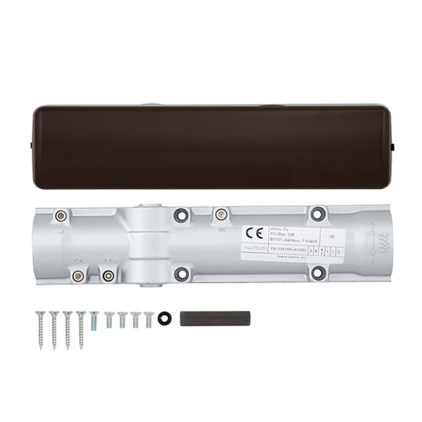 Фінська ТМ ABLOY по праву вважається одним із європейських лідерів виробництва дверної фурнітури. Успішне поєднання якості та сучасного дизайну є ключовим фактором такого успіху. Дана модель дотягувача ABLOY DC330 встановлюється накладним монтажем на внутрішні та зовнішні дверні полотна з максимальною вагою до 80 кг та шириною до 1100 мм. Безпосередньо на корпусі є можливість регулювати основну швидкість, швидкість захлопування та гальмо відчинення. Дана функція захищає дверне полотно від удару об стіну та виривання тяги дотягувача. Особливістю цієї моделі є встановлений всередині кулачковий вал, з допомогою якого зменшується опір при відчиненні дверей. За рахунок цього досягається ще більш комфортне їхнє використання. Загалом завдяки таким можливостям регулювання можна добитись максимально індивідуального налаштування зачинення дверей так, як Вам потрібно. Гідравлічне масло в даній моделі високої якості. Завдяки цьому проблем при роботі дотягувача при перепаді температур не буде. Взагалі його робоча температура варіюється в діапазоні від -35 до +50°С. Крім того, даний дотягувач сертифікований для використання з протипожежними дверима. В даній комплектації відсутня тяга. Вона замовляється окремо в залежності від Ваших потреб. В коричневому кольорі найкраще буде доповнювати двері аналогічних темних відтінків для того, щоб максимально уникнути контрастів та не привертати зайвої уваги.