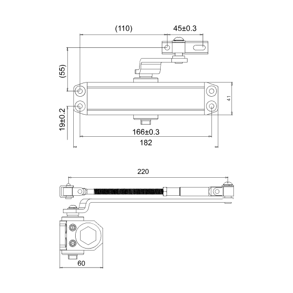 У даній комплектації дотягувач оснащений стандартною тягою без функції фіксації у відкритому положенні. Це робить його універсальним для використання в різних приміщеннях. Коричневий колір корпусу гармонійно доповнить двері відповідних відтінків, забезпечуючи стильний вигляд і непомітність.