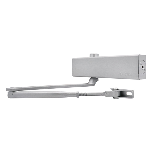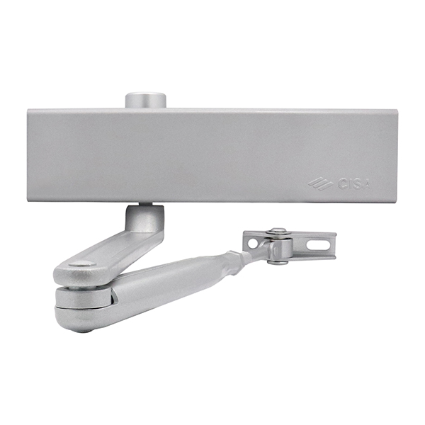 CISA C1610.03 – це надійний дотягувач із серії Professional Plus2, що призначений для накладного монтажу на внутрішніх і зовнішніх дверях. Він підходить для дверних полотен із максимальною вагою до 80 кг і шириною до 1100 мм. На передній частині корпусу розташовані регулювальні гвинти, які дозволяють налаштувати основну швидкість зачинення (в межах 180°-15°), швидкість захлопування (15°-0°) та функцію гальма відчинення (180°-50°). Ця функція, також відома як "вітрове гальмо," забезпечує додатковий захист дверного полотна, запобігаючи його удару об стіну чи пошкодженню механізму тяги.