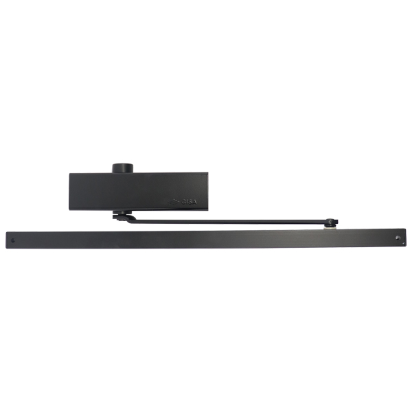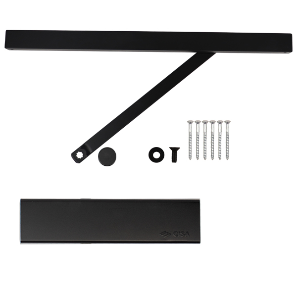 Комплектація включає ковзну тягу без функції фіксації дверного полотна у відкритому положенні. Водночас цей дотягувач сертифікований для використання з протипожежними дверима, що робить його оптимальним вибором для забезпечення безпеки в приміщеннях з високими вимогами до пожежної стійкості.