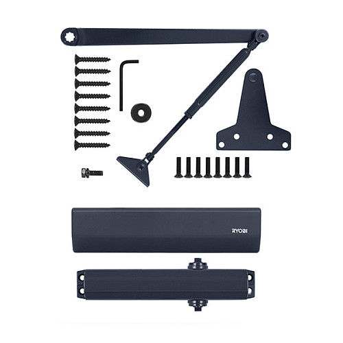 Продукція японського виробника RYOBI по праву визнана в усьому світі завдяки своїй відмінній якості. Дана модель RYOBI D-2550 BC UNIV встановлюється накладним монтажем на дверні полотна масою до 80 кг та шириною до 1100 мм. Є можливість встановлення за допомогою кронштейна паралельного положення тяги відносно дверей задля збереження дизайну приміщення чи використання дотягувача в умовах обмеженого простору. Тоді максимальна вага і ширина полотна повинні бути меншими. Гідравлічний привід забезпечує чітку роботу дотягувача з кутом відкривання до 180°. Безпосередньо на корпусі є можливість регулювати основну швидкість в межах 180°-10°, швидкість захлопування - 10°-0° та гальмо відчинення - 75°-180°. Дана функція захищає дверне полотно від удару об стіну та виривання тяги дотягувача. Завдяки цьому можна досягнути індивідуального налаштування зачинення дверей так як Вам потрібно. Особливістю дотягувачів RYOBI є спеціальне термоконстантне масло. Воно забезпечує стабільну роботу навіть при великому перепаді температур. Взагалі робоча температура варіюється в діапазоні від -20 до +45°С. RYOBI D-2550 BC UNIV може бути встановлений на ліво і правосторонні двері з можливістю відкривання як всередину так і назовні. В даній комплектації присутня стандартна тяга без фіксації дверного полотна у відкритому положенні. Проте даний дотягувач сертифікований для використання з протипожежними дверима. В кольорі "сірий антрацит" найкраще буде доповнювати двері подібних відтінків для того, щоб максимально уникнути контрастів та не привертати зайвої уваги.