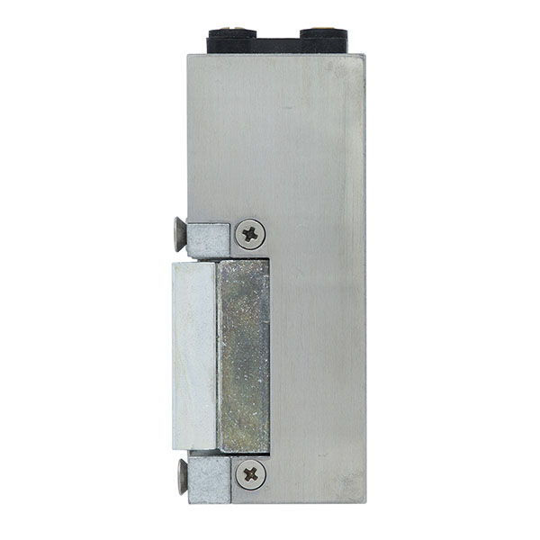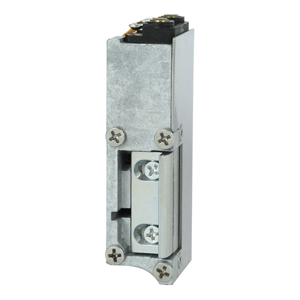 Електрозащіпка працює в нормально замкненому стані. Це означає, що вона замкнена без живлення, а відмикання відбувається поданням напруги. Напруга складає 6-12В постійного струму. Має язичок спеціальної радіальної форми, яка при відкриванні зміщується в глибину защіпки. За рахунок цього виріз в рамі під нього потрібен буде мінімальний. Язичок регулюється відносно корпусу з діапазоном 5 мм. Зворотня планка докуповується окремо в залежності від Ваших потреб.