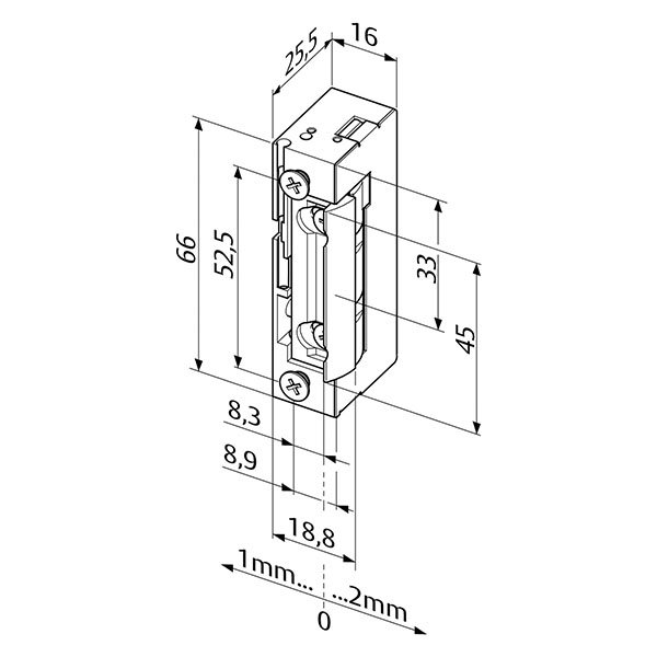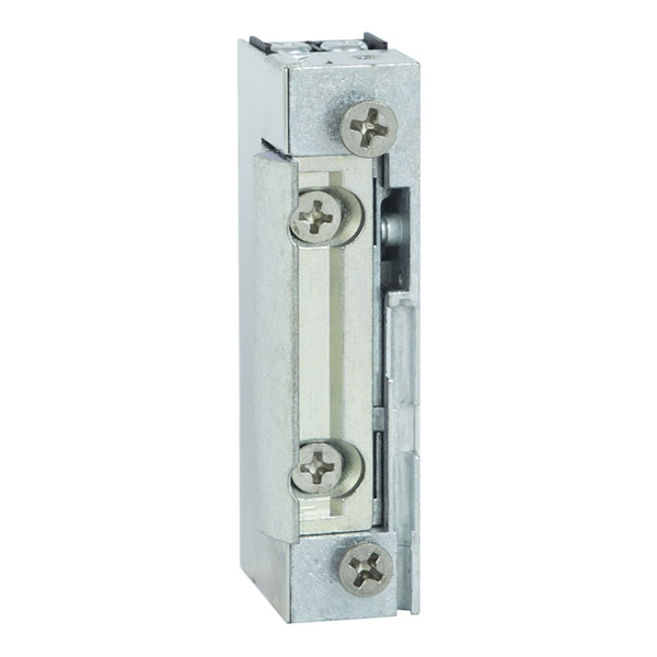 Електрозащіпка працює в нормально замкненому стані. Це означає, що вона замкнена без живлення, а відмикання відбувається поданням напруги. Напруга складає 10-24 В постійного або змінного струму. Має язичок спеціальної радіальної форми, яка при відкриванні зміщується в глибину защіпки. За рахунок цього виріз в рамі під нього потрібен буде мінімальний. Язичок регулюється відносно корпусу з діапазоном 3 мм. Зворотня планка докуповується окремо в залежності від Ваших потреб.