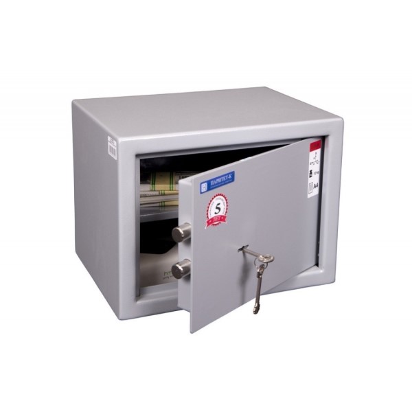Корпус і двері сейфа виготовлені із металу завтовшки 1,5 і 2 мм відповідно. Закривається ключовим сувальдним замком. Замикання здійснюється обертовими ригелями діаметром 16 мм. Вони забезпечать практичний захист від можливості їх перепилювання. В сірому кольорі відмінно доповнить будь-яке сучасне приміщення.