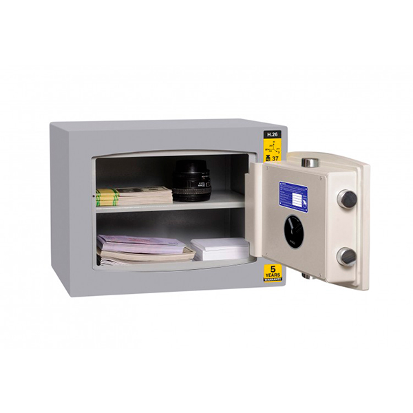 Стінки корпуса даного сейфа заповнені фортифікаційним бетоном товщиною 25 мм. Двері виготовлені із металу завтовшки 14 мм. Разом із механічним кодовим замком LaGard це створить суттєву перепону для зловмисника. Замикання здійснюється ригельною системою тристоронньої дії. Товсті обертові ригеля діаметром 25 мм забезпечать практичний захист від можливості їх перепилювання. Петлі в формі антизрізів мають внутрішнє виконання, тому їх збити абсолютно неможливо. В сірому кольорі відмінно доповнить будь-яке сучасне приміщення.