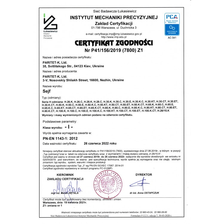 У комплекті йдуть інструкція з експлуатації та паспорт з серійним номером. Гарантія на конструкцію сейфа складає 5 років, на замок 1 рік.