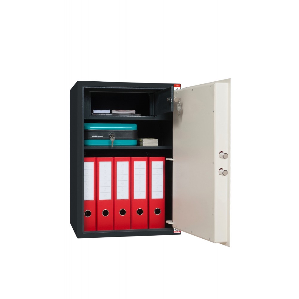 Корпус і двері сейфа виготовлені із металу завтовшки 3 мм. Разом із ключовим сувальдним замком це створить перепону для зловмисника. Замикання здійснюється обертовими ригелями діаметром 16 мм. Вони забезпечать практичний захист від можливості їх перепилювання. В поєднанні антрацитово-сірого з кремово-білим кольором відмінно доповнить будь-яке сучасне приміщення.