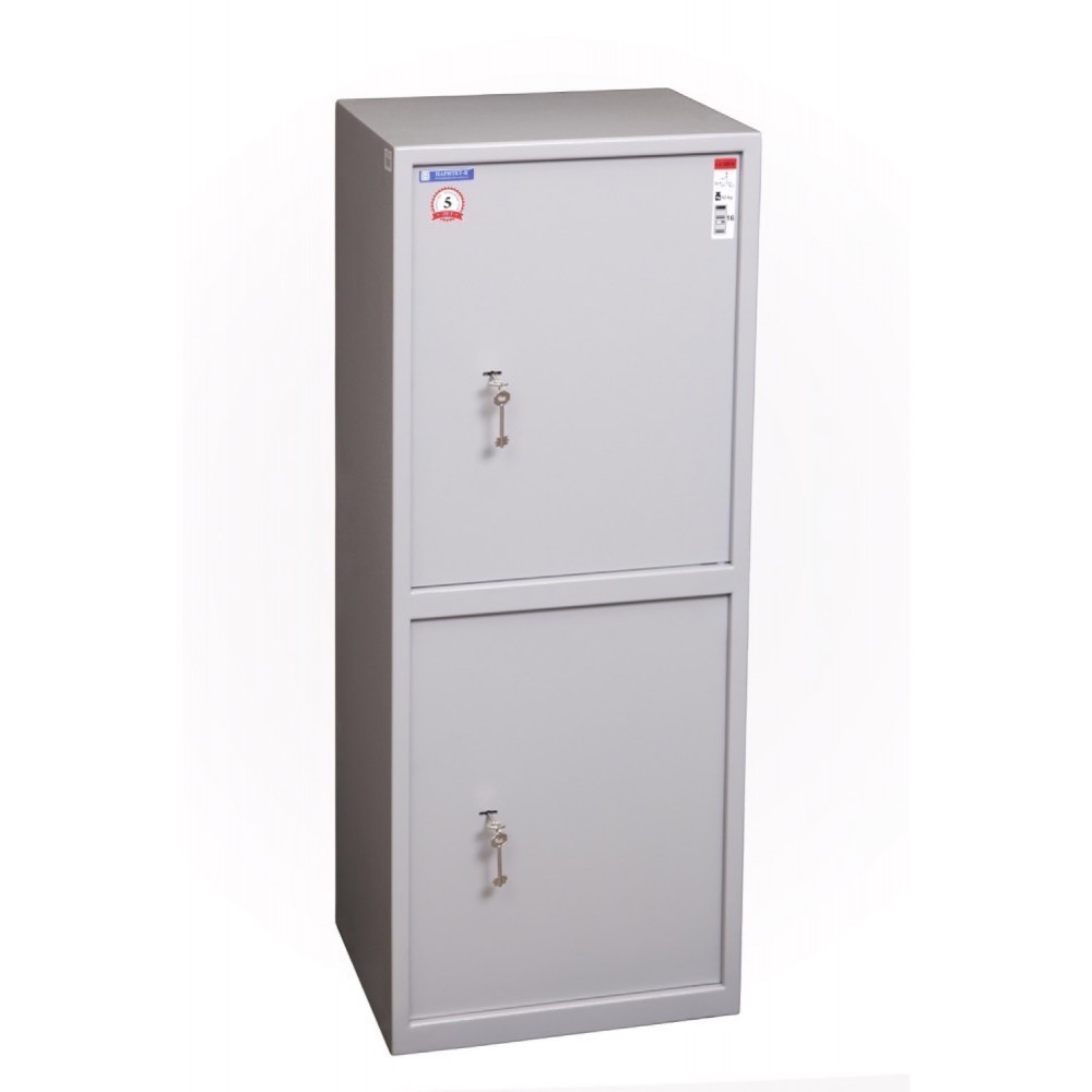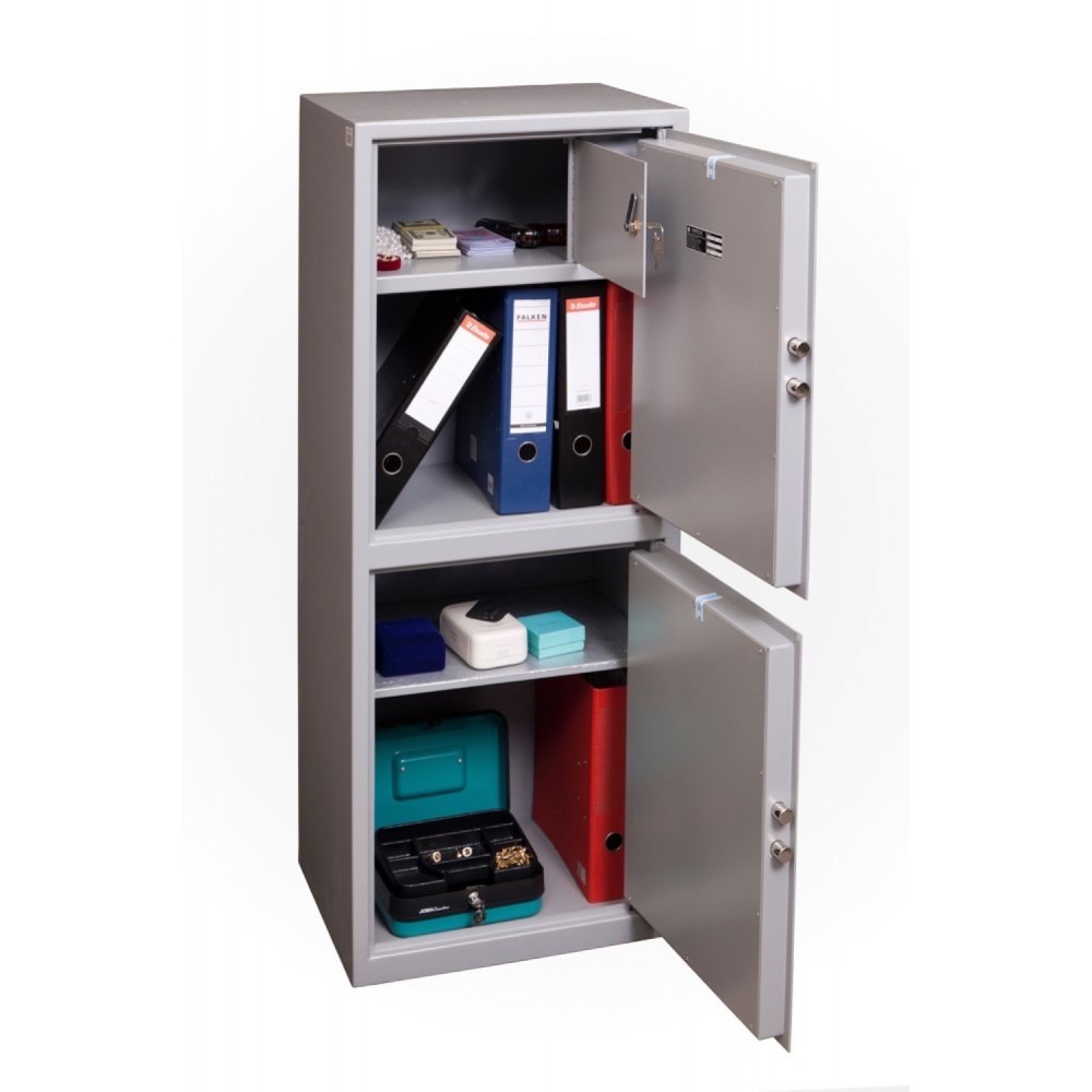 Корпус і двері сейфа виготовлені із металу завтовшки 2 та 3 мм відповідно. Замикання здійснюється двома ключовими сувальдними замком, які керують 4-ма ригелями діаметром 16 мм. Вони обертові, що забезпечує практичний захист від можливості їх перепилювання. В сірому кольорі сейф відмінно доповнить будь-яке сучасне приміщення та не буде привертати зайву увагу.