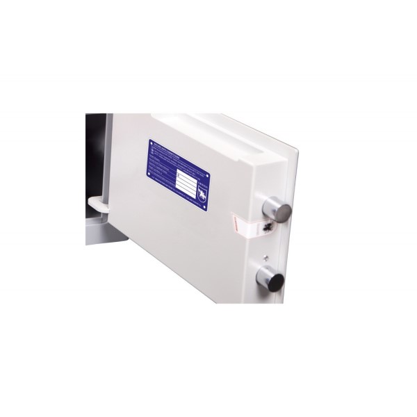 Корпус і двері сейфа виготовлені із металу завтовшки 3 і 4 мм відповідно. Разом із ключовим сейфовим замком STUV це створить суттєву перепону для зловмисника. Замикання здійснюється товстими обертовими ригелями діаметром 25 мм. Вони забезпечать практичний захист від можливості їх перепилювання. Петлі в формі антизрізів мають внутрішнє виконання, тому їх збити абсолютно неможливо. В сірому кольорі відмінно доповнить будь-яке сучасне приміщення.