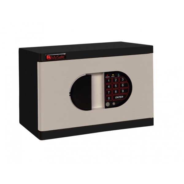 Корпус і двері сейфа виготовлені із металу завтовшки 2 мм. Закривається електронним кодовим замком MySafe. Замикання здійснюється товстими обертовими ригелями діаметром 25 мм. Вони забезпечать практичний захист від можливості їх перепилювання. Петлі в формі антизрізів мають внутрішнє виконання, тому їх збити абсолютно неможливо. В поєднанні чорного та кремово-білого кольорів відмінно доповнить будь-яке сучасне приміщення.