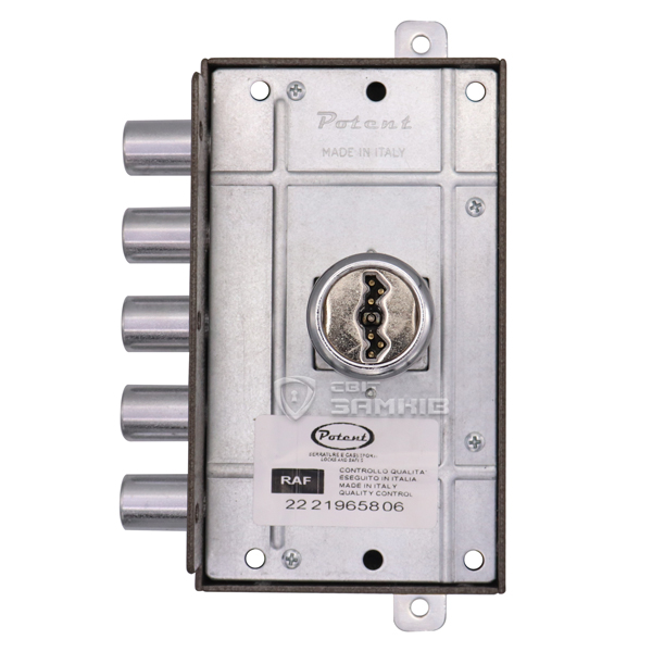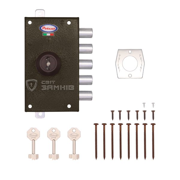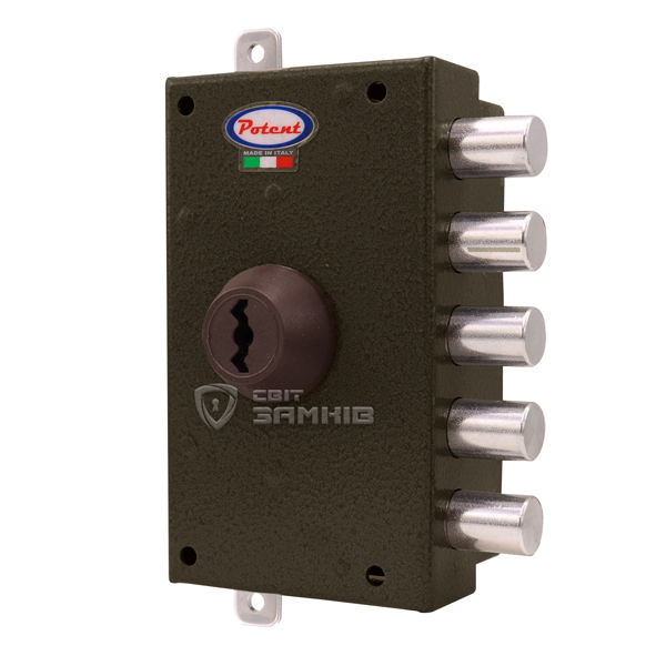 POTENT 1725 – це 5-ригельний італійський замок із вузьким корпусом. Встановлюється НАКЛАДНИМ способом на дверне полотно. Використовується на вхідних дерев’яних та металевих дверях квартири чи будинку. Також його часто обирають для монтажу в гаражах чи складських приміщеннях, де встановити врізний замок немає можливості або це не доцільно.