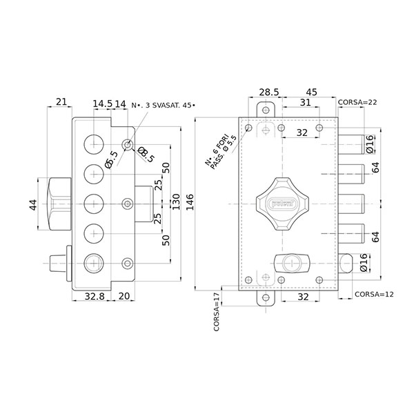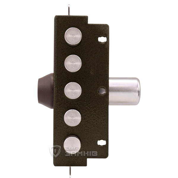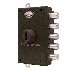 Дана модель призначена для дверей ЛІВОГО відкривання. Замок керується серцевиною з помповим ключем. Вона приводить в дію 5 круглих стальних ригелів діаметром 16 мм та додаткові провушини, до яких можна під’єднати тяги і девіатори. Завдяки цьому закривання відбувається в 3 сторони. Повний вихід ригелів становить 22 мм. При відкриванні та закриванні дверей ключ «виштовхується» із серцевини. Такі ключі мають малі розміри, тому їх зручно носити в кишені чи сумці невеликого розміру. Броньована серцевина володіє захистом від провертання методом “згортку” та стійкою до висвердлювання захисною шайбою. Додаткові штифти в кодовій частині забезпечують 170 000 можливих комбінацій та захист від відмичок. Це робить майже неможливими підбір ключа. Ригелі захищені від забивання. В даній комплектації присутній циліндр довжиною 70 мм. В разі більшої або меншої товщини дверей є можливість замовити модель замка із іншою довжиною – 50, 60 або 80 мм