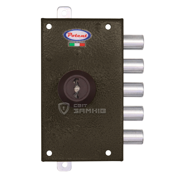 POTENT 1725 – це 5-ригельний італійський замок із вузьким корпусом. Встановлюється НАКЛАДНИМ способом на дверне полотно. Використовується на вхідних дерев’яних та металевих дверях квартири чи будинку. Також його часто обирають для монтажу в гаражах чи складських приміщеннях, де встановити врізний замок немає можливості або це не доцільно.