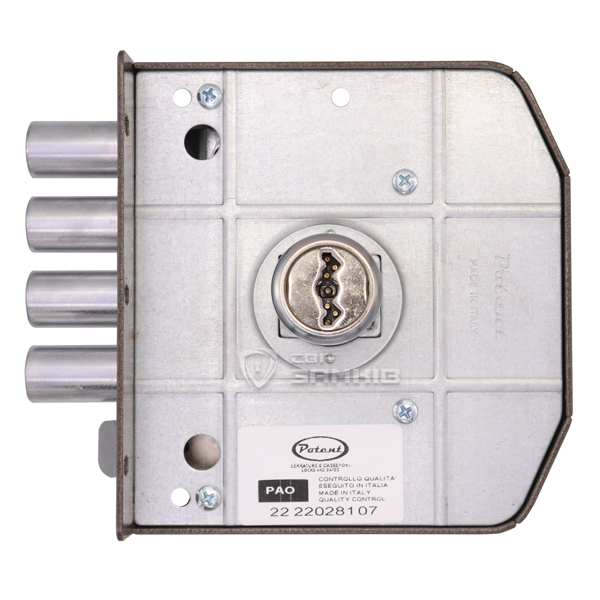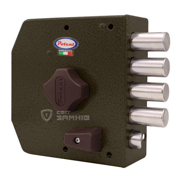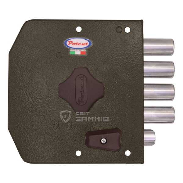 POTENT 435 – це 4-ригельний італійський замок. Встановлюється НАКЛАДНИМ способом на дверне полотно. Використовується на вхідних дерев’яних та металевих дверях квартири чи будинку. Також його часто обирають для монтажу в гаражах чи складських приміщеннях, де встановити врізний замок немає можливості або це не доцільно.