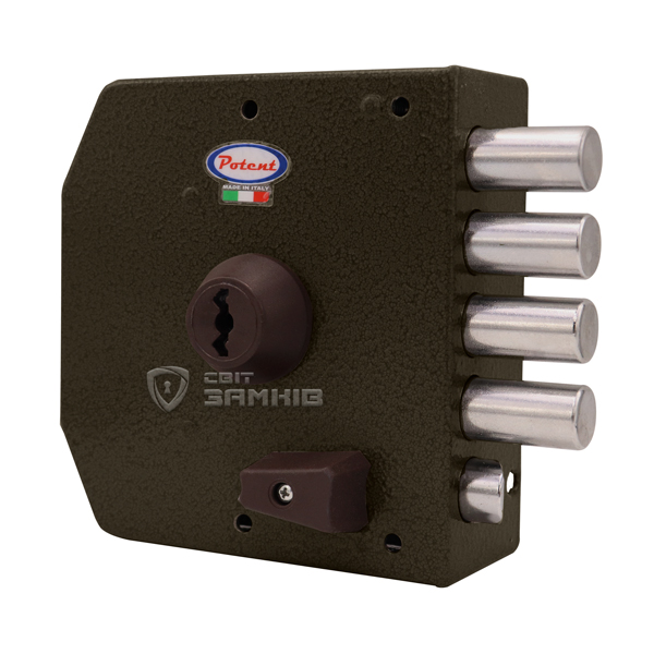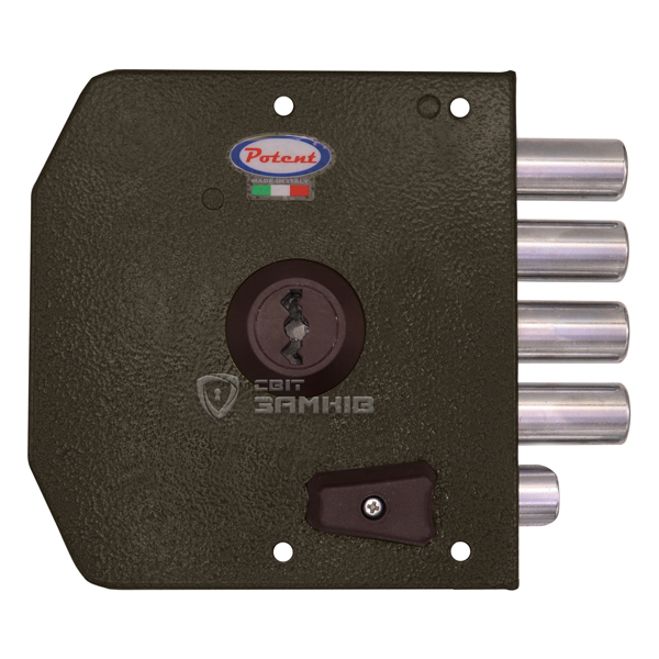 POTENT 440 – це 4-ригельний італійський замок. Встановлюється НАКЛАДНИМ способом на дверне полотно. Використовується на вхідних дерев’яних та металевих дверях квартири чи будинку. Також його часто обирають для монтажу в гаражах чи складських приміщеннях, де встановити врізний замок немає можливості або це не доцільно.