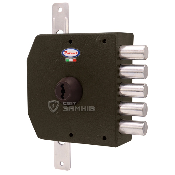 POTENT 500 – це 5-ригельний італійський замок. Встановлюється НАКЛАДНИМ способом на дверне полотно. Використовується на вхідних дерев’яних та металевих дверях квартири чи будинку. Також його часто обирають для монтажу в гаражах чи складських приміщеннях, де встановити врізний замок немає можливості або це не доцільно.