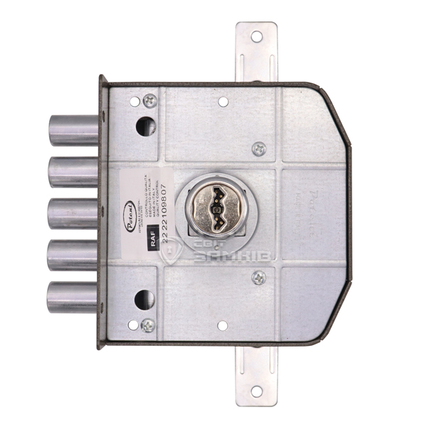 Дана модель призначена для дверей ПРАВОГО відкривання. Замок керується серцевиною з помповим ключем. Вона приводить в дію 5 круглих стальних ригелів діаметром 18 мм та додаткові провушини, до яких можна під’єднати тяги і девіатори. Завдяки цьому закривання відбувається в 3 сторони. Повний вихід ригелів становить 32 мм. При відкриванні та закриванні дверей ключ «виштовхується» із серцевини. Такі ключі мають малі розміри, тому їх зручно носити в кишені чи сумці невеликого розміру. Броньована серцевина володіє захистом від провертання методом “згортку” та стійкою до висвердлювання захисною шайбою. Додаткові штифти в кодовій частині забезпечують 170 000 можливих комбінацій та захист від відмичок. Це робить майже неможливими підбір ключа. Ригелі захищені від забивання. В даній комплектації присутній циліндр довжиною 70 мм. В разі більшої або меншої товщини дверей є можливість замовити модель замка із іншою довжиною – 50, 60 або 80 мм. Зворотня планка входить в комплект.