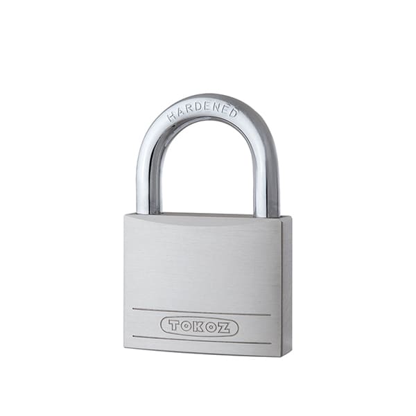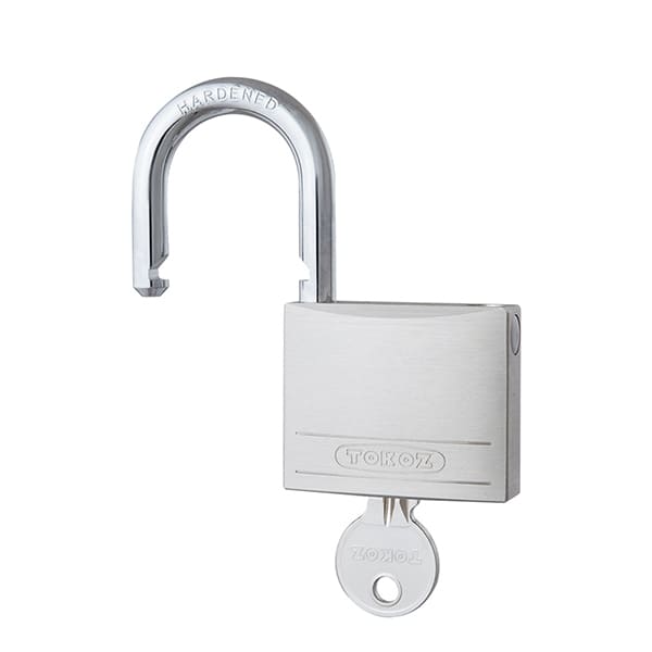 Навісний замок TOKOZ BETA 50. Можна використовувати в приміщенні та на вулиці. Матеріал виготовлення корпусу – латунь. Дужка виготовлена із гартованої сталі, що забезпечує захист від силового зламу. Керується серцевиною з англійським ключем. Якщо натиснути на дужку замок закриється автоматично, без використання ключа. В такому замку ключ можна вийняти і в закритому, і в відкритому стані.