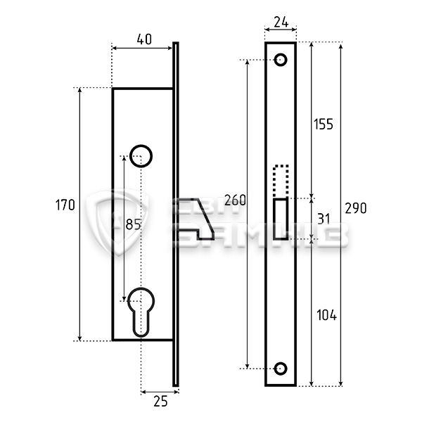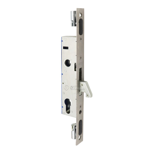 Замок Euro-Elzett VEKTOR - це врізний замок, який встановлюється на розсувні дерев'яні та металеві двері. Особливістю цього замка є гакоподібний ригель, який виготовлений із сталі. Його повний вихід складає 25,5 мм. При зачиненні він надійно фіксується в зворотній планці. Керується замок серцевиною стандарту EURO DIN. Вона в комплект не входить та докуповується окремо в залежності від ваших потреб. Особливістю цього замка є наявність провушин для кріплення тяг.