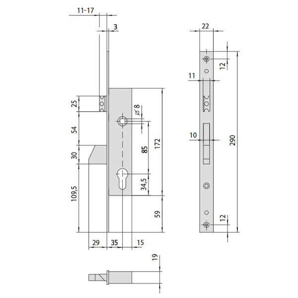 Опис Механізм замка CISA 46215.35 язичок (BS35*85мм, 22 мм) нержавіюча сталь